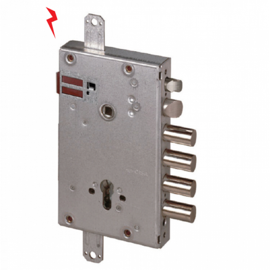 Ηλεκτρική κλειδαριά κυλίνδρου θωρακισμένης πόρτας, 4 πίροι, γλώσσα πάνω. Η κλειδαριά είναι διαθέσιμη με κέντρο 63mm ή 100mm.