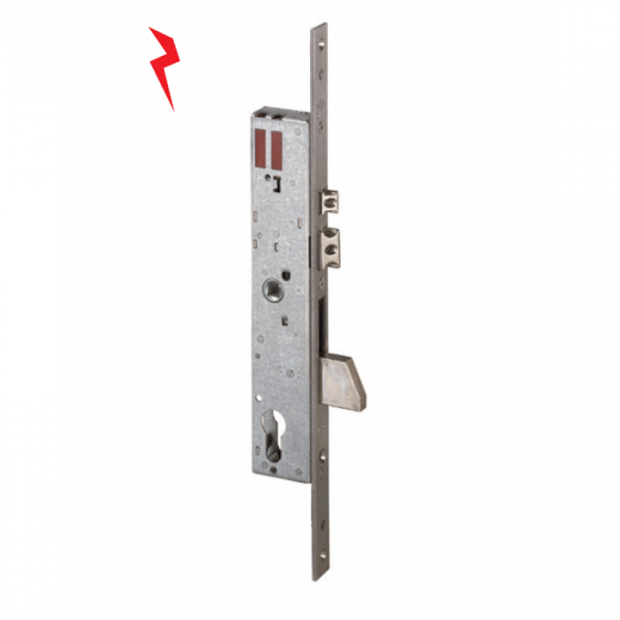 Ηλεκτρική κλειδαριά με μαχαιρωτή γλώσσα. Mπορεί να συνδεθεί με ρεύμα (12V AC/DC) ώστε με το πάτημα του BUTTON να τραβιέται η γλώσσα του πόμολου. Η κλειδαριά είναι διαθέσιμη με κέντρο 35mm.